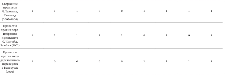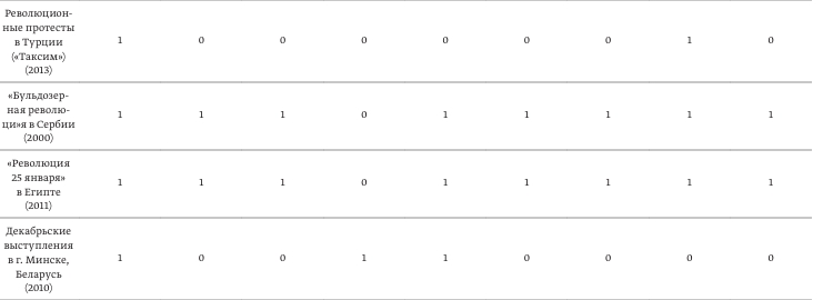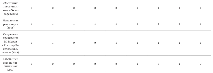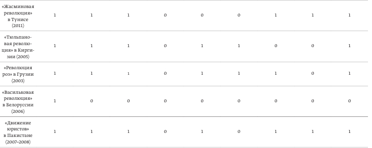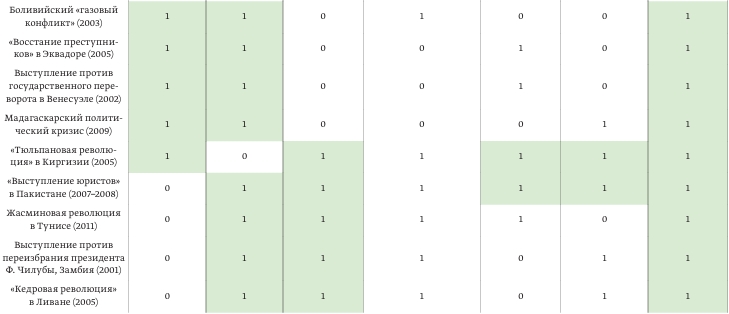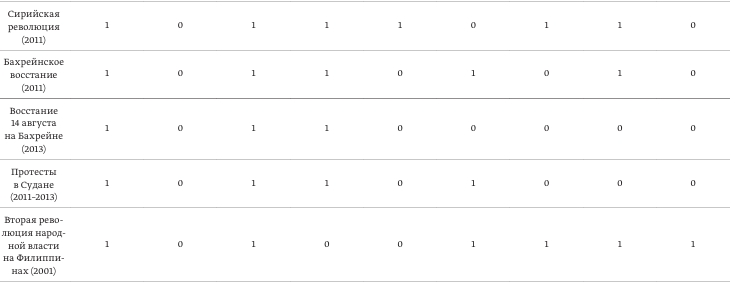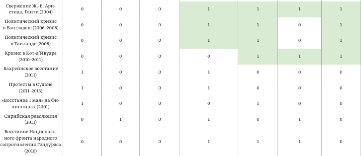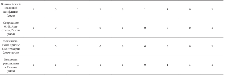 Если рассмотреть другие конфигурации, которые описывают остальные кейсы (см. Приложение), то можно заметить следующие закономерности. Подтвердилось влияние на успех революции отсутствия поддержки правящего режима извне. Однако этот фактор присутствует либо в связке с поддержкой протестующих извне (в трех конфигурациях), либо с разнообразием по этнорелигиозному признаку (тоже в трех конфигурациях).