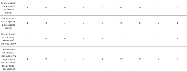 Div_socdem[1]Div_pol[1]Div_etnorelig[1]Reg_support[0]Sec_def[1]*Camp_size[1] (Украина, Сербия+Тунис+Пакистан+Египет(2011), Таиланд) + Div_socdem[1]*Div_pol[1]Div_etnorelig[1]Camp_support[0]Sec_def[1]Camp_size[1] (Украина, Сербия+Пакистан+Непал+Ливан) + Div_socdem[1]Reg_support[0]Camp_support[0]State_def[1]Sec_def[1]*Camp_size[1] (Египет (2011), Таиланд+Филиппины+Эквадор, Венесуэла+Египет (2013)) Div_socdem[1]*Div_pol[1]Div_etnorelig[1]Reg_support[0]Camp_support[1]State_def[1]*Camp_size[0] (Киргизия+Грузия («Революция роз»)) + Div_socdem[1]*Div_pol[1]Div_etnorelig[1]Reg_support[1]Camp_support[1]State_def[0]* Sec_def [1] (Замбия+Ливан) + Div_socdem[1]Div_pol[0]Div_etnorelig[1]Reg_support[0]State_def[0]Sec_def [0] Camp_size[0] (Таити+Бангладеш, Таиланд (2008)) + Div_socdem[1]Div_pol[0]Reg_support[0]Camp_support[1]State_def[0]Sec_def[0] Camp_size[0] (Таити+Кот-д’Ивуар) + Div_socdem[1]Div_pol[0]Div_etnorelig[1]Reg_support[1]Camp_support[0]State_def[1] Sec_def [1]* Camp_size[0] (Боливия) + Div_socdem[0]Div_pol[0]Div_etnorelig[0]Reg_support[1]Camp_support[1]State_def[1] Sec_def [1]* Camp_size[0] (Мадагаскар) +