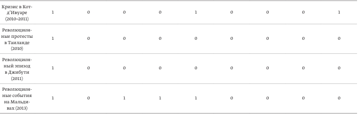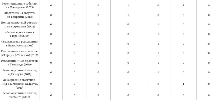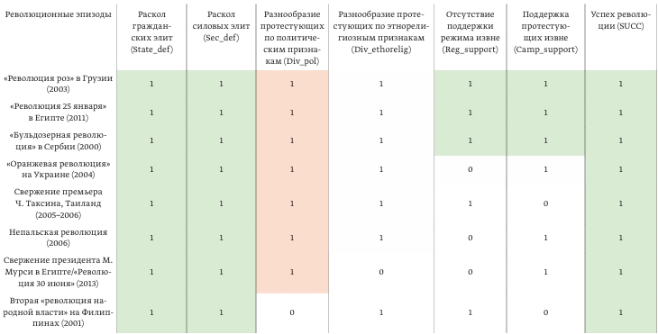 Таблица 1. Перечень проанализированных революционных эпизодов с их формализированными характеристиками