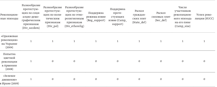 Как мы видим, наибольшее влияние на революционный успех, согласно полученным формулам, имеют разнообразие протестующих по политическим признакам (то есть широкая революционная коалиция) или одновременный раскол и гражданских, и силовых элит. В конфигурациях, покрывающих абсолютное большинство кейсов, именно эти факторы являются ключевыми.