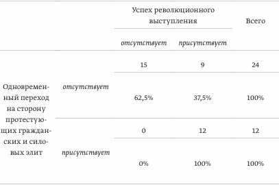 Таблица 3. Корреляция между одновременным переходом на сторону протестующих гражданских и силовых элит и успехом революционного выступления