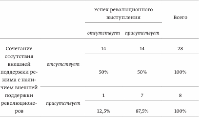 Таблица 4. Корреляция между сочетанием отсутствия внешней поддержки режима с наличием внешней поддержки революционеров и успех революционного выступления
