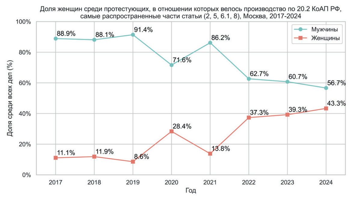 Авторитарные режимы опасаются протестов, так как они могут повлиять на политическую стабильность режима и теоретически привести к его смене (Reuter, Robertson 2015). Поэтому, чтобы проверить, продолжает ли наблюдаться «женская скидка» даже в особенных делах, мы анализируем решения по наиболее часто применяемой к протестующим статье — 20.2 КоАП РФ («Нарушение установленного порядка организации либо проведения собрания, митинга, демонстрации, шествия или пикетирования») — и ее распространенным частям (2, 5, 6.1, 8) в Москве с 2017 по 2024 год. Мы сфокусированы на Москве, так как именно в столице проходили самые массовые протестные акции прошедших десятилетий, и на нее зачастую же