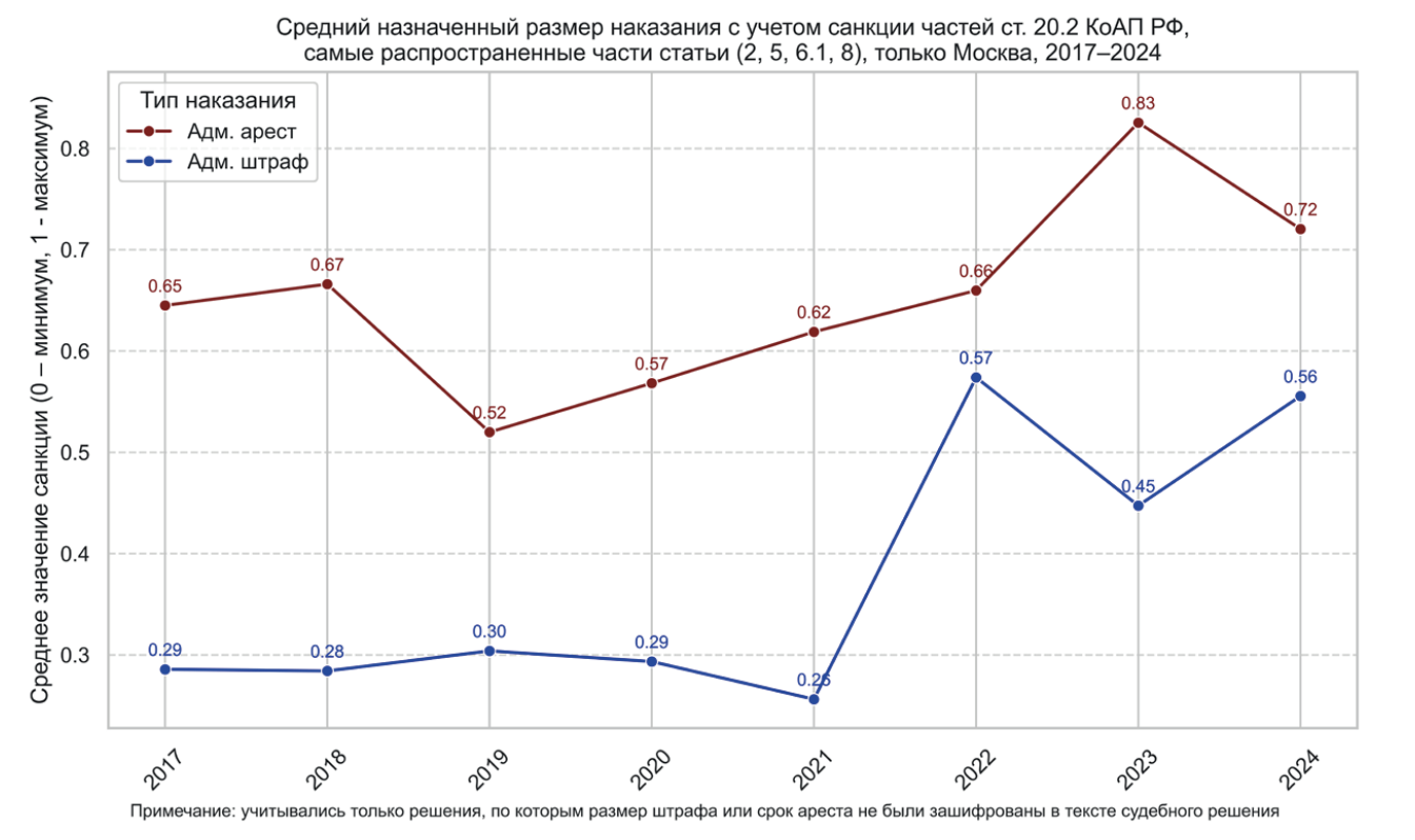 Изображение 3. Средние размеры наказаний (нормализованные) по ст. 20.2 КоАП РФ, Москва, 2017–2024 гг.