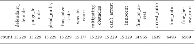 После автоматизированного сбора данных и обработки текстов судебных решений мы получили информацию о ряде переменных из карточек дел (имя судьи, часть дела, дата решения), в то время как другие данные были получены нами из текстов решений с помощью регулярных выражений (ключевые переменные — гендер обвиняемого, гендер судьи, а также контрольные — наличие адвоката или представителя, наличие смягчающих и отягчающих обстоятельств).