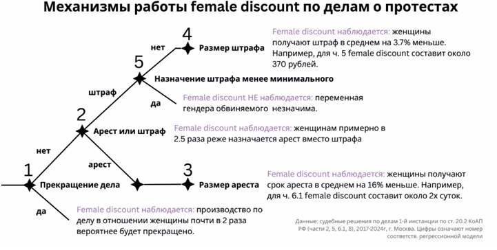 Для ответа на поставленный вопрос мы собрали и проанализировали тексты судебных решений, до сих пор редко использующиеся в социально-правовых исследованиях в России (Жучкова и др. 2025). Анализ решений по наиболее распространенным частям статьи 20.2 КоАП РФ (2, 5, 6.1, 8), чаще всего вменяемых участникам протестов, показал, что, при контроле прочих факторов, «женская скидка» существует почти на всех этапах процесса принятия судебных решений: от решения о прекращении производства по делу до размера назначенного наказания. Проявление «женской скидки» в особых делах, имеющих значение для режима, дополнительно демонстрирует очень устойчивый характер этого явления.