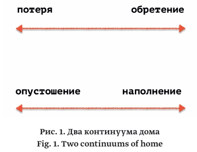 В тексте я развиваю аргумент, который в целом сводится к следующему: понимания дома как пустого физического пространства с четкими границами, открытого заполнению/опустошению, как практик синхронизации и аффективных привязанностей или как процесса, а не стабильной и устойчивой сущности, недостаточно для того, чтобы уловить различные версии становления и разрушения дома. Несмотря на то что такие трактовки дома открывают возможность для прослеживания трансформаций дома, они нечувствительны к множественным версиям, которые может принимать дом. В трактовке Дуглас и аналогичных ее концептуализации моделях, которые я рассмотрел выше, внимание, как правило, направлено на две точки континуума: потерю или обретение дома. В случае с концептуализацией дома как контейнера, континуум существует на другом уровне: от опустошения до заполнения физического пространства дома (рис. 1).